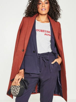 Manteau droit mi-long en laine mélangée couleur terre à col tailleur et fermeture à double boutonnage croisé façon corne et poches passepoilées sur les côtés de Promod