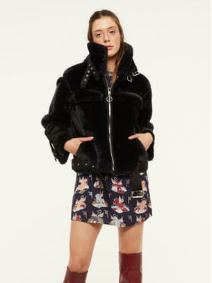 Manteau court en fausse fourrure couleur bleu nuit à col montant et pattes de serrage avec fermeture zippée argentée et poches passepoilées sur le devant d'Elevenparis