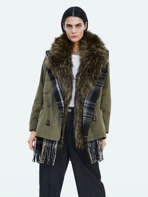 Parka courte kaki doublée deux fois avec un col amovible en fausse fourrure et une écharpe écossaise frangée en laine à fermeture zippée et liens de serrage de Zara