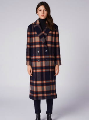 Long manteau droit en laine mélangée avec carreaux multicolores à col tailleur et fermeture à double boutonnage croisé noir avec poches passepoilées sur le devant de Pablo