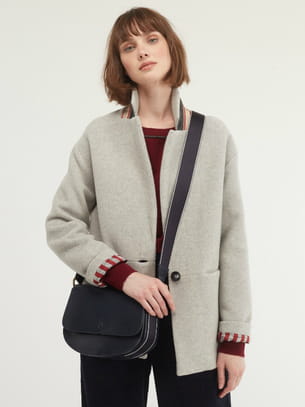Caban court en laine mélangée couleur gris souris fermé par un bouton noir à emmanchures tombantes avec détails graphiques imprimés sous le col et poches passepoilées sur les côtés de Chloé Stora