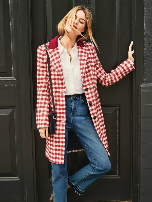 Manteau droit mi-long en laine mélangée à imprimé vichy rouge, blanc et rose à col tailleur avec empiècement en velours et poches à rabat sur les côtés à fermeture à simple boutonnage façon corne de Boden
