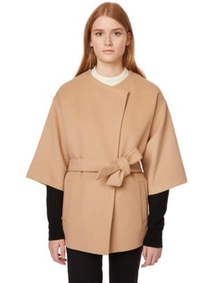 Manteau court ceinturé en laine mélangée couleur sable à encolure ronde avec manches trois-quarts chauve souris et poches passepoilées sur les côtés de Monoprix