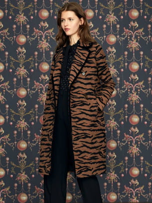 Manteau droit mi-long en jaquard motif tigre couleur camel à col cranté orné d'un liseré contrastant noir avec fermeture à double boutonnage croisé marron et poches passepoilées d'Idano