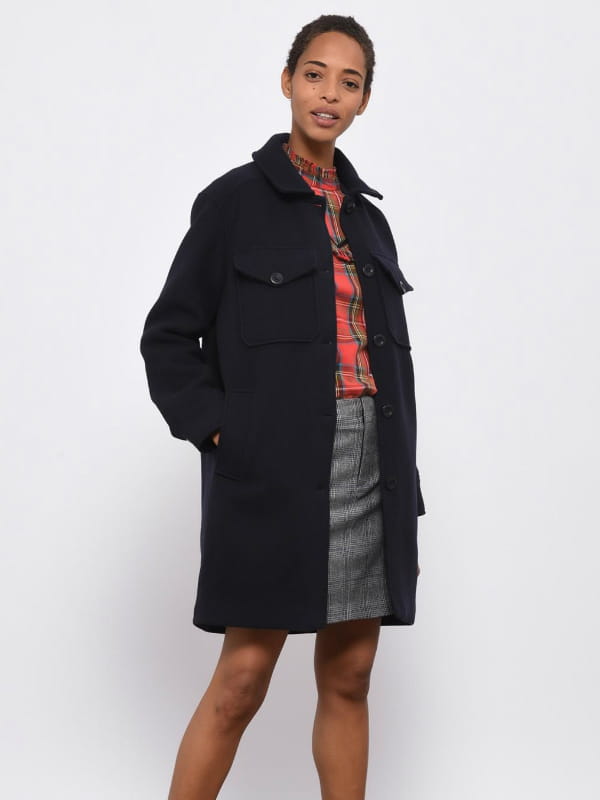 Manteau droit mi-long couleur navy à poches à rabat boutonnées sur la poitrine et fermeture à simple boutonnage noir avec petit col en pointe et poches passepoilées sur les côtés de Leon & Harper