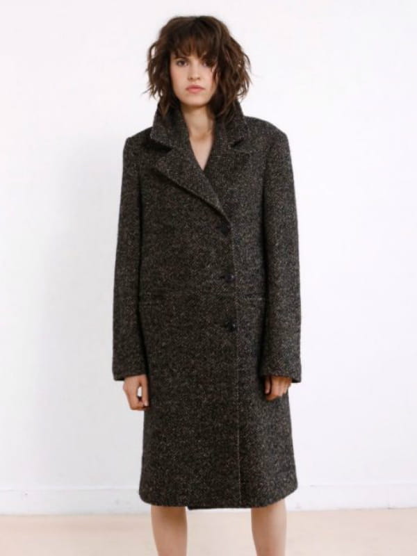 Manteau droit mi-long en tweed gris anthracite à col cranté et fermeture boutonnée croisée sur un côté avec épaulettes de Swildens