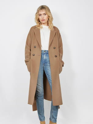 Long manteau ceinturé droit et oversize en laine couleur camel à col tailleur et fermeture à double boutonnage croisé façon corne avec emmanchures tombantes et poches plaquées sur les côtés d'Anine Bing