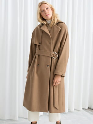 Long trench oversize ceinturé en laine mélangée couleur camel à manches amples et large col cranté avec fermeture à double boutonnage croisé façon corne et rabats-tempête d'& Others Stories