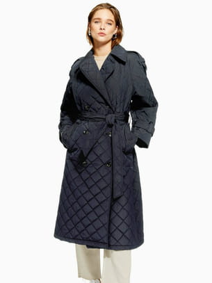 Long trench ceinturé couleur bleu marine à matelassage losange avec col cranté et fermeture à double boutonnage croisé noir et poches passepoilées sur les côtés et pattes de serrage de Topshop