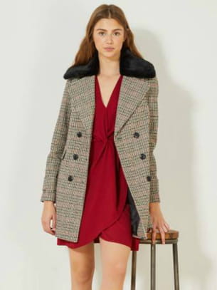 Manteau court à effet lainé beige avec motifs à carreaux à col cranté et empiècement en fourrure synthétique noire avec fermeture à double boutonnage croisé noir et fausses poches à rabat sur les côtés de Kiabi