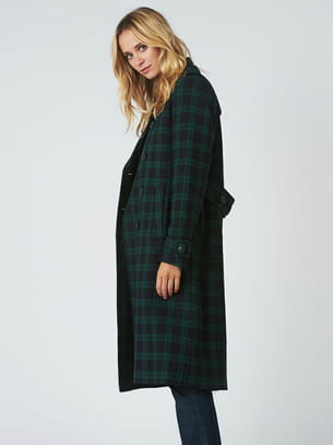 Trench mi-long ceinturé couleur bleu marine et vert sapin à carreaux écossais et fermeture à double boutonnage croisé noir avec col tailleur et poches passepoilées sur les côtés de Bérénice