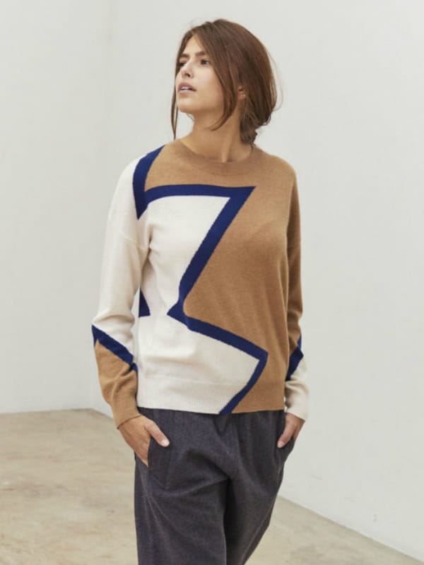 Pull ample en cachemire à imprimé graphique couleur cappuccino à encolure ronde et emmanchures tombantes avec bordures côtelées de Kujten