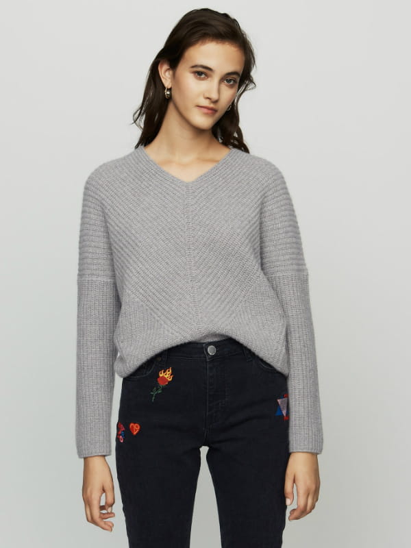 Pull oversize en cachemire texturé gris à décolleté V devant et derrière avec manches tombantes de Maje