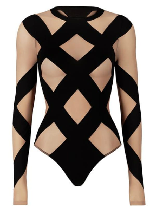 Body string à encolure ronde avec tissu transparent couleur chair et grands croisillons opaques noirs de Wolford
