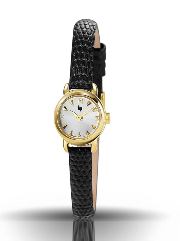 Petite montre à inspiration vintage avec boitier rond en acier doré et bracelet en cuir noir façon lézard de Lip