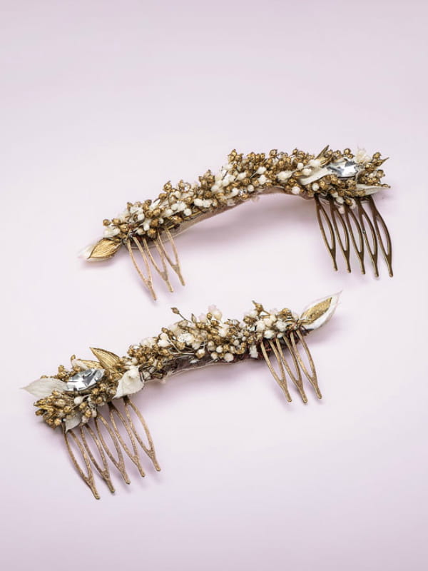 Duo de peignes en cristaux Swarovski et fleurs éternelles blanches et or de Les Couronnes de Victoire