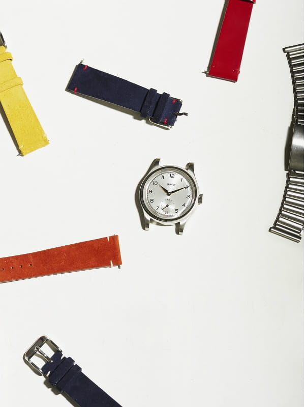 Montre unisexe avec bracelet interchangeable et boitier en inox avec cadran argenté et écritures rouges et noirs de Merci