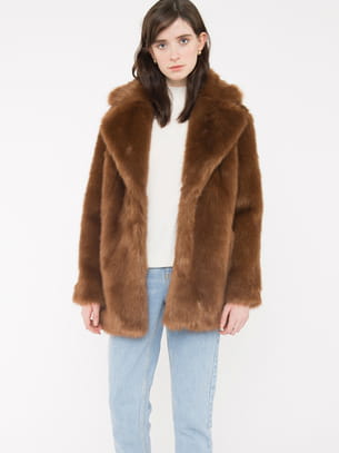Manteau en fourrure synthétique oversize couleur chocolat à large col revers cranté et slogan rose dragée "Faux Real." dans le dos de Jakke