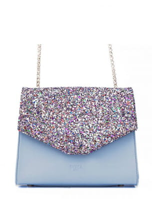 Petit sac bandoulière à chaîne en cuir lisse couleur bleu ciel avec rabat interchangeable pailleté multicolores de Poka Paris
