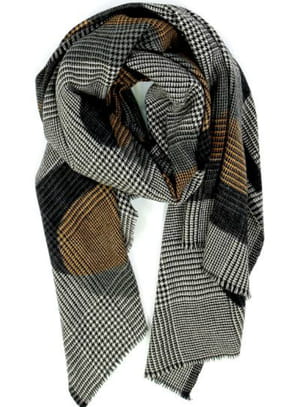 Foulard 100% laine avec jeu de reflet végétal ocre et gris anthracite fondu sur un imprimé Prince de Galles noir et blanc de Ma Poésie