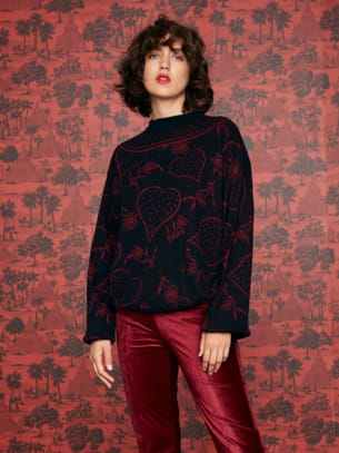 Pull en laine et viscose noire à col légèrement montant et coupe loose avec ourlets élastiques et motifs cœurs et fleurs rouges d'Idano