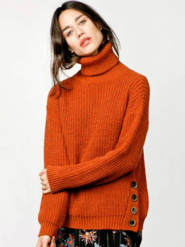 Long pull en alpaga mélangé à maille côtelée couleur safran à col roulé et manches ballons tombantes avec boutons façon corne sur un côté de Les Petites...