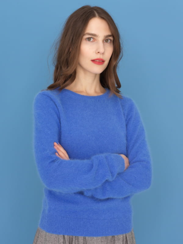 Pull en angora mélangé couleur bleu azur à encolure ronde et extrémités côtelées de Le Mont St Michel