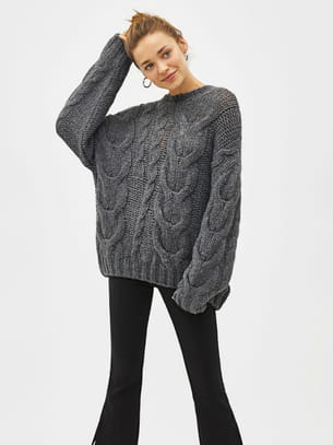 Pull oversize en acrylique gris anthracite à col rond et détails torsades avec larges extrémités côtelées de Bershka