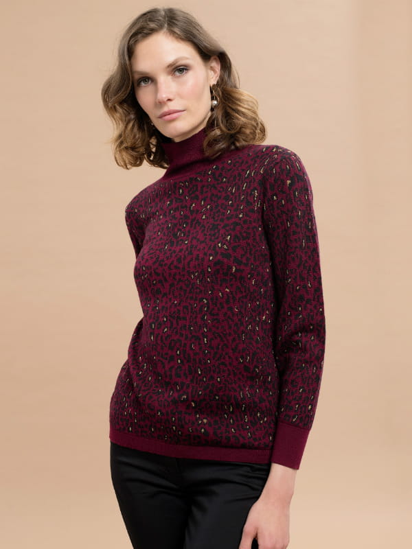 Pull droit en laine mérinos mélangée couleur grenat à imprimé léopard avec col cheminée et bords-côtes côtelés d'Un Jour Ailleurs