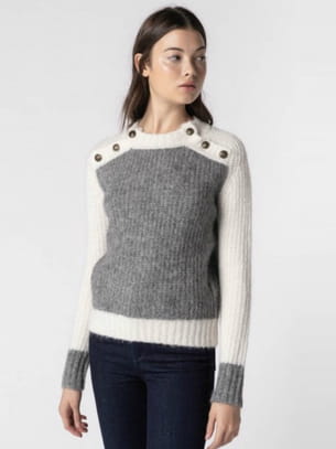 Pull en alpaga mélangé gris et blanc à col rond et fermeture boutonnée argentée avec finitions bords-côtes et maille striée de Pablo