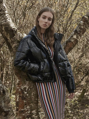 Doudoune courte oversize en matière brillante craquelée noire à capuche et fermeture zippée avec poches passepoilées sur le devant et petits bords-côtes de Primak