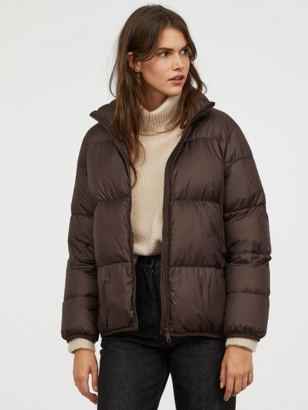 Doudoune courte oversize couleur chocolat à col légèrement montant et fermeture glissière ton sur ton avec poches zippées dissimulées sur les côtés et fins bords-côtes d'H&M
