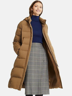 Longue doudoune droite couleur crème à capuche et fermeture zippée ton sur ton avec poches passepoilées sur les côtés d'Uniqlo