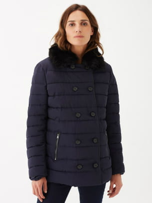 Doudoune courte droite couleur bleu marine à col en fausse fourrure noire et poches zippées argentées sur le devant avec fermeture à double boutonnage croisé façon corne de Burton of London