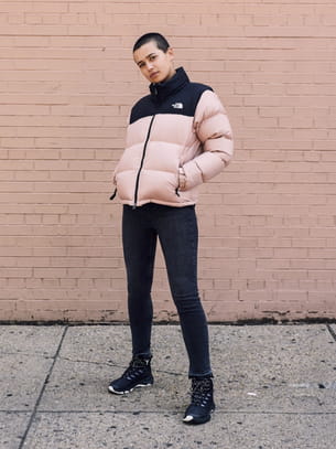 Doudoune courte oversize couleur rosée et empiècement noir à col montant et capuche avec fermeture glissière contrastante noire et poches passepoilées sur le devant de The North Face