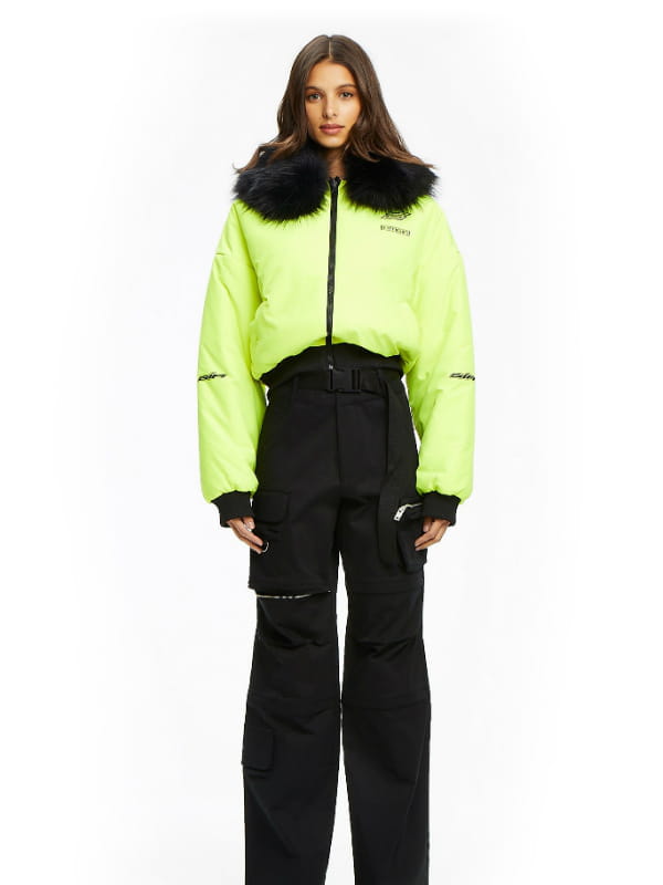 Doudoune courte oversize couleur jaune néon à col revers en fausse fourrure noire avec fermeture zippée contrastante et larges bords-côtes côtelés élastiques d'I.AM.GIA