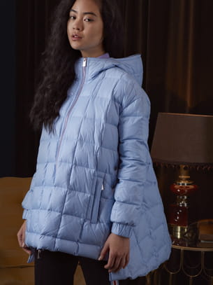 Doudoune mi-longue oversize et asymétrique couleur bleu ciel à capuche et fermeture zippée argentée avec poches passepoilées sur le devant et fentes latérales avec boutons-pressions de LU MEI London