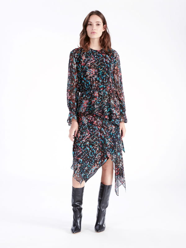 Robe midi asymétrique en voile tacheté multicolores à col rond ras du cou et poignets volantés avec élastique à la taille d'Iro