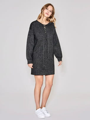 Robe-pull courte et droite en maille grise Lurex® à encolure ronde lacée et emmanchures tombantes avec manches ballons et larges bords-côtes aux poignets de Suncoo