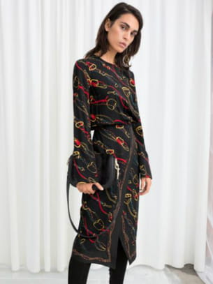 Robe midi noire ajustée à col rond ras du cou et bas croisé avec imprimé esprit foulard et haut drapé d'& Other Stories