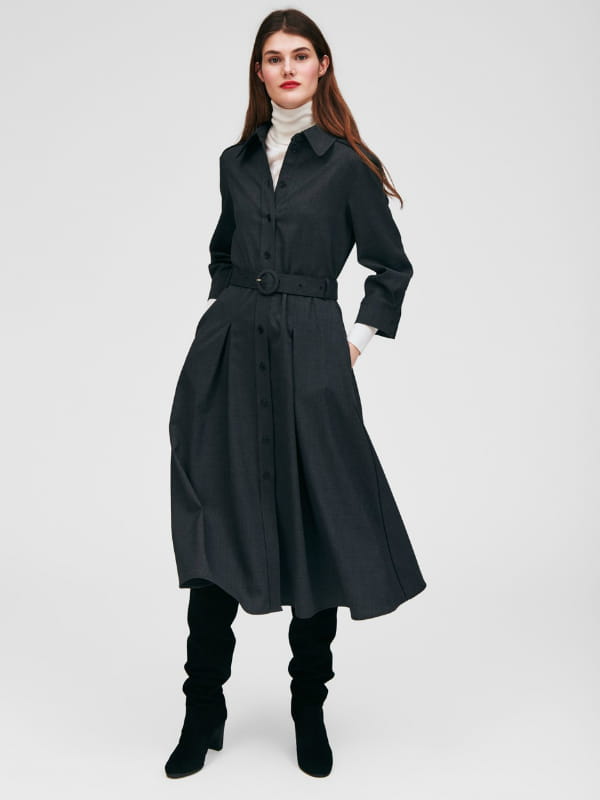 Robe midi ceinturée en flanelle gris chiné foncé à col chemise et fermeture boutonnée de Tara Jarmon