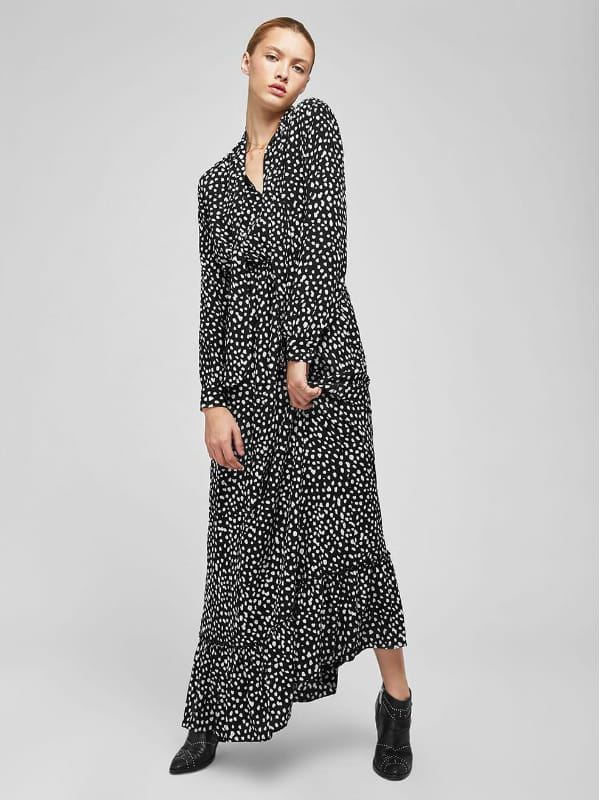 Longue robe fluide en soie tachetée noire et blanche à col V avec liens à nouer et petits bords-côtes aux poignets avec élastique à la taille d'Anine Bing