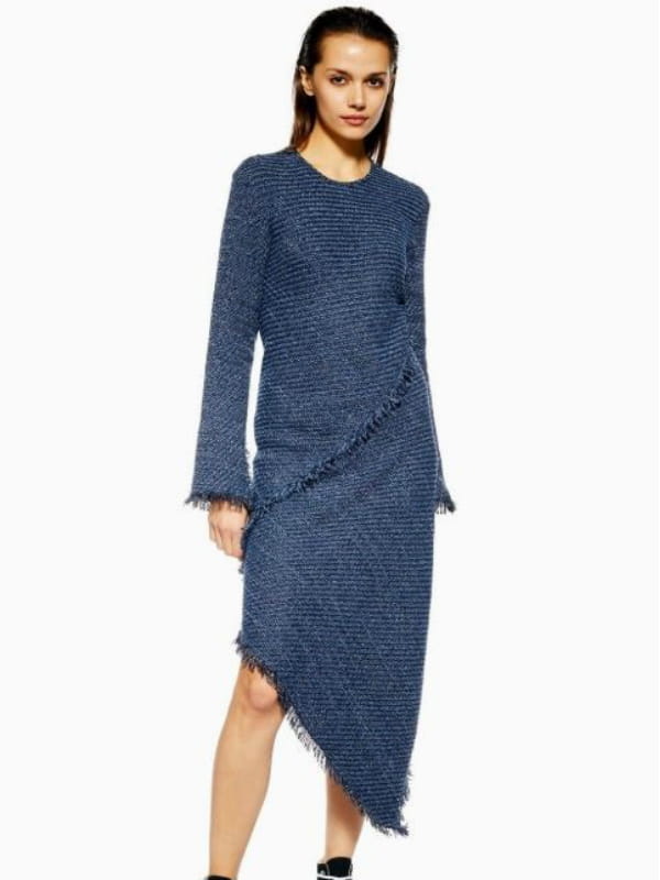 Robe midi asymétrique et droite à effet tweed couleur jean et manches évasées avec jeux de superposition et finitions effilochées de Topshop