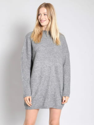 Robe-pull courte et oversize couleur gris souris à col légèrement montant et emmanchures tombantes avec jeux de maille et petit bords-côtes côtelés de Pimkie