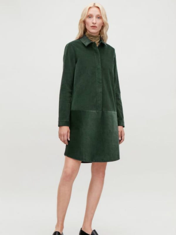 Robe-chemise courte et oversize en coton façon peau de pêche couleur vert bouteille à col en pointe et fermeture boutonnée dissimulée avec poches passepoilées sur le devant de COS