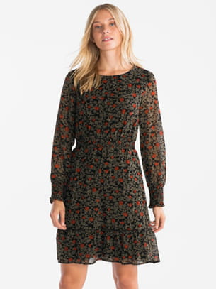 Robe cintrée courte et fluide en voile noir à imprimés floraux rouges et kaki et col rond avec larges bords-côtes smockés aux poignets et bas volanté de C&A