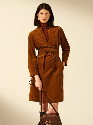 Robe midi droite et ceinturée en velours côtelé couleur miel à encolure tunisienne et détails surpiqués ton sur ton et poches passepoilées sur les côtés de Vanessa Bruno