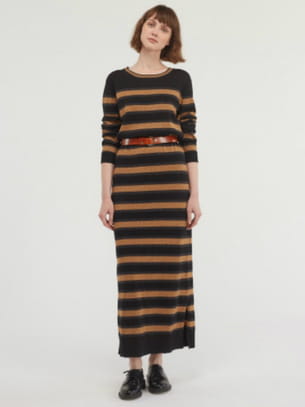 Longue robe-pull droite en maille noire à rayures horizontales en Lurex® couleur sable et col rond avec fentes latérales et bords-côtes côtelés de Chloé Stora