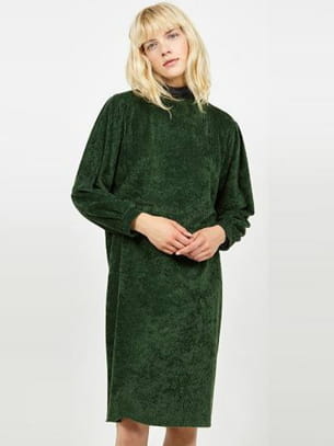 Robe courte et droite effet velours côtelé couleur vert sapin à col légèrement montant et manches ballons avec emmanchures tombantes et petits bords-côtes d'American Vintage