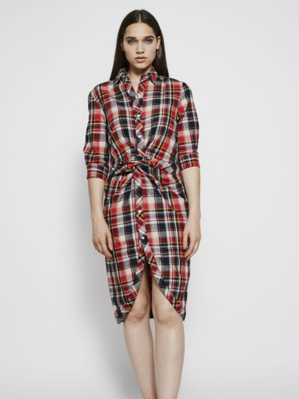 Robe-chemise ajustée coupe midi et asymétrique en coton rouge, noir et blanc à motifs carreaux écossais avec fermeture boutonnée et détail drapé à la taille d'Elevenparis